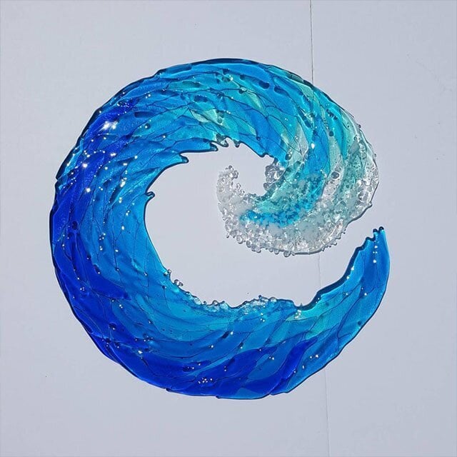 Each delicate piece of resin is hand cut and shaped to create the graceful wave. We carefully placed each piece of resin to create the image of swirling, moving blue water.
